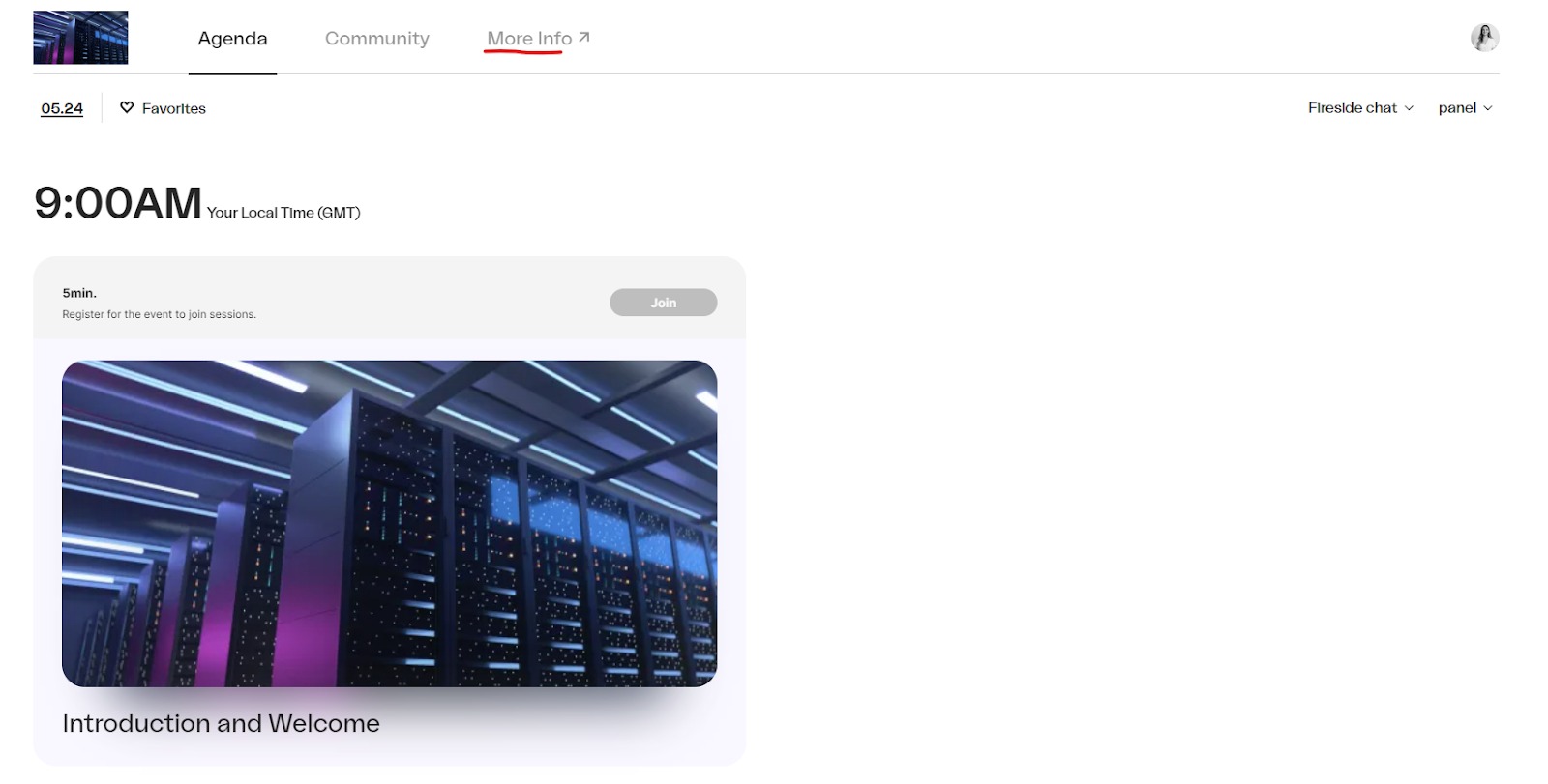 To browse other areas of the event whilst you are watching a session, simply click "More Info" at the top of the Virtual Venue.”
